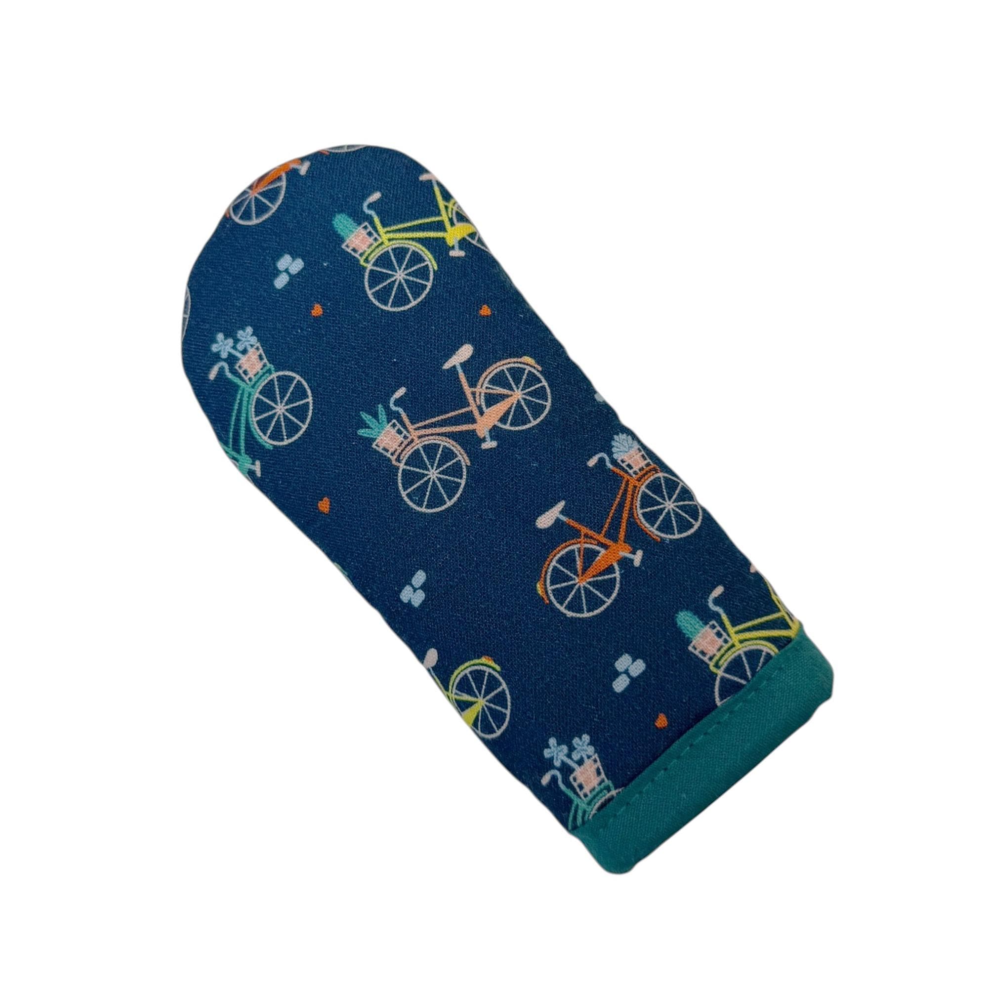 Mini bicycles with flower baskets are placed on a dark teal background with peach lining and teal trim.