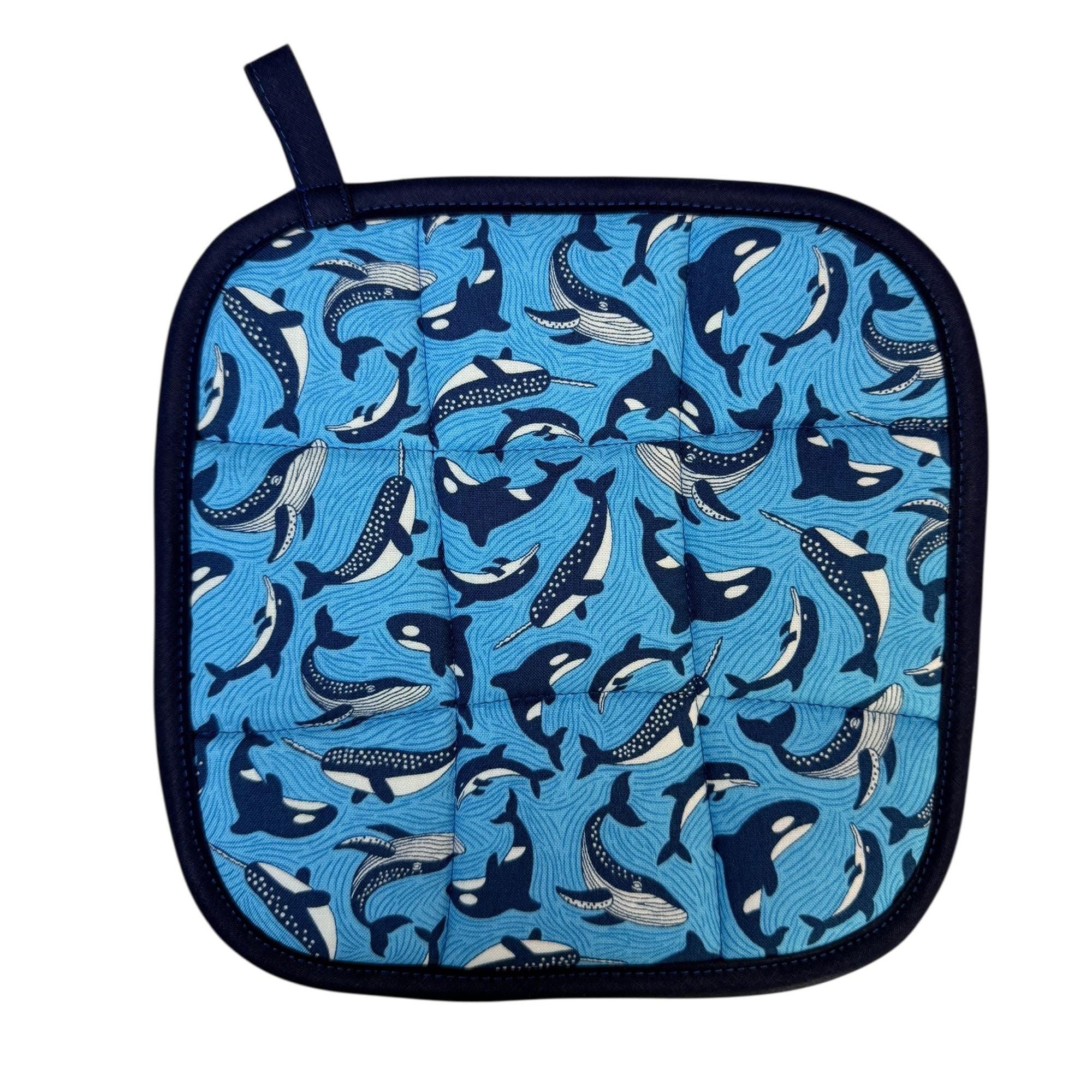 Whales, dolphins and narwhals are placed on a blue background with navy blue lining and navy blue trim.