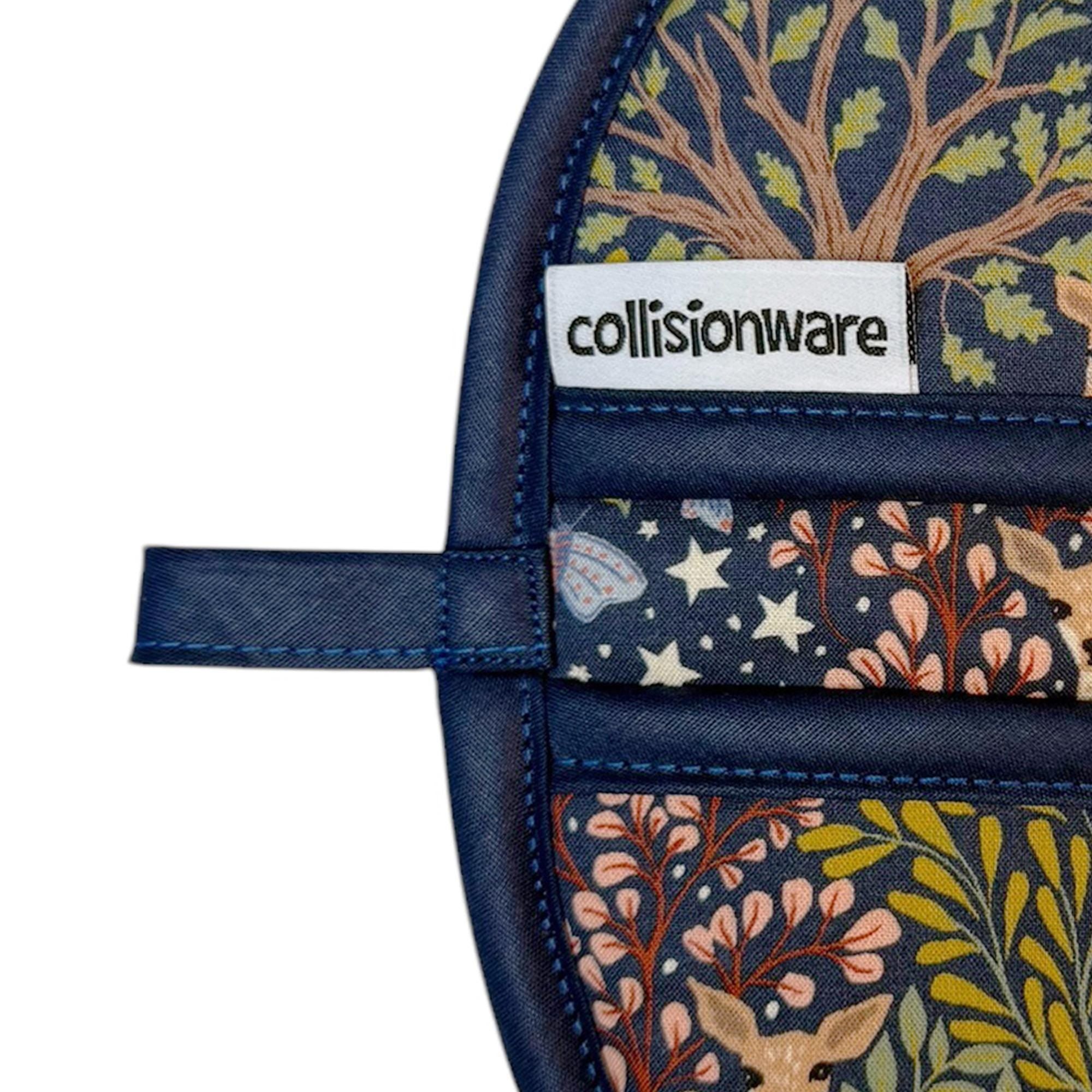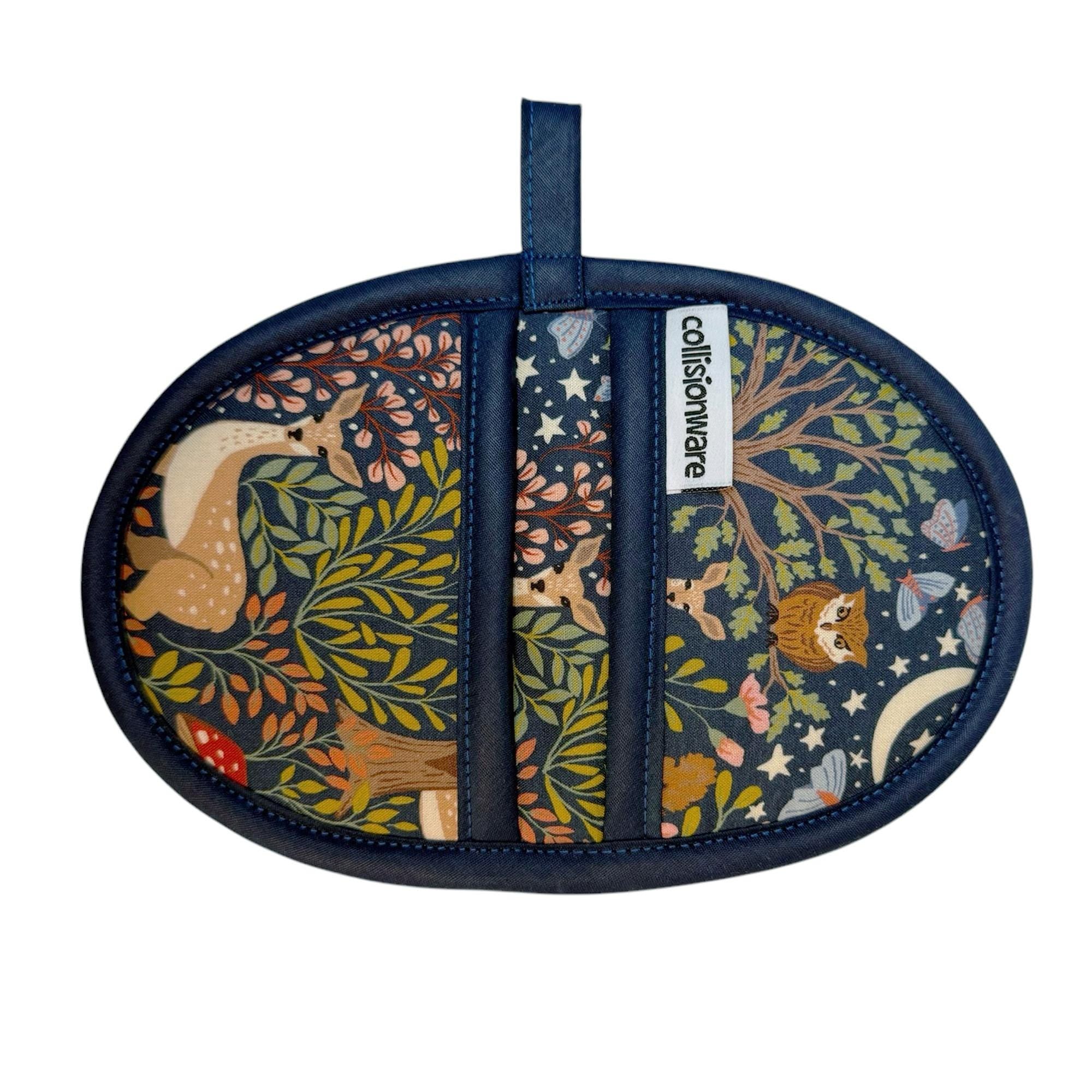 Forest animals are placed on a navy background with a navy blue lining and navy blue trim.