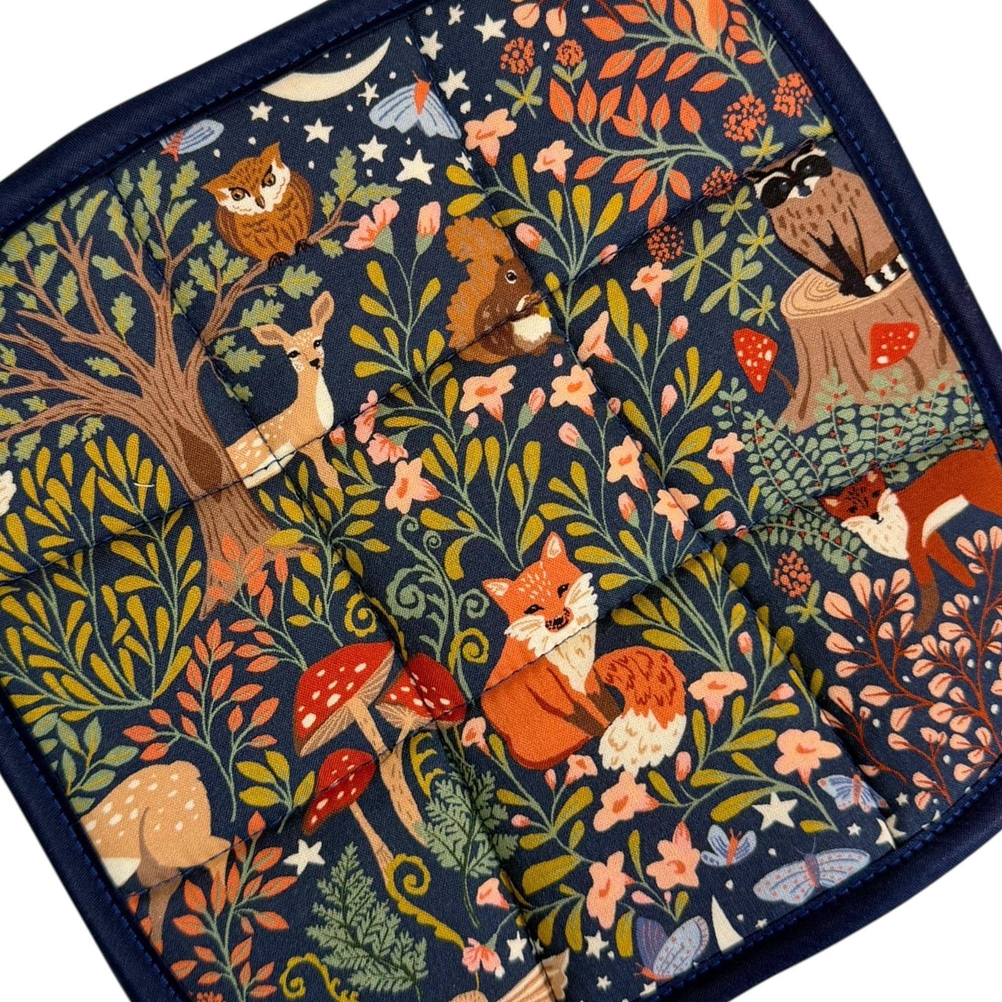 Forest animals are placed on a navy background with a navy blue lining and navy blue trim.
