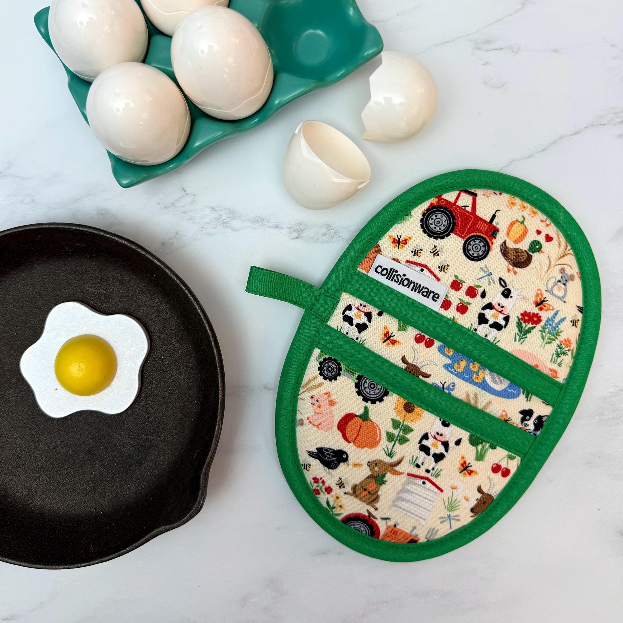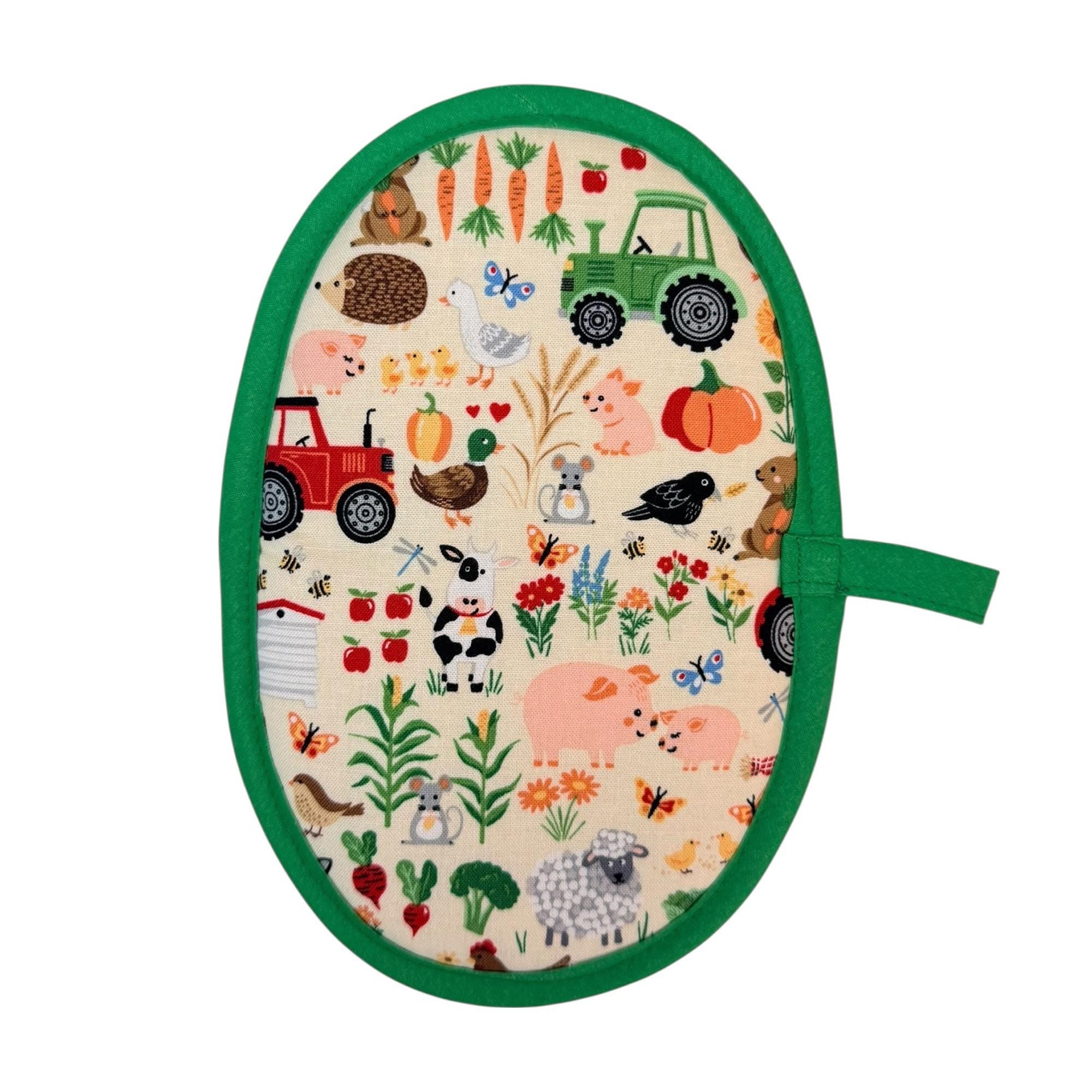 Farm animals and veggies are placed on a cream background with green lining and green trim.