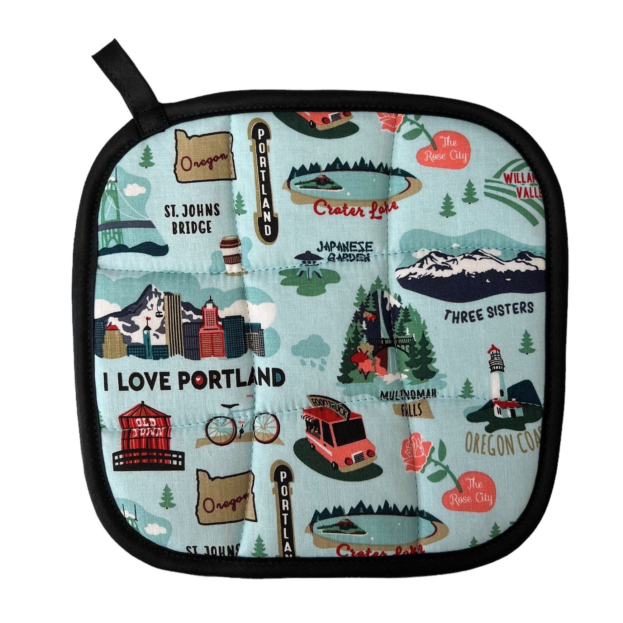 Oregon-inspired pot holder features Portland's skyline, the coastal charm, and the majesty of Crater Lake and Multnomah Falls. Bring a piece of the Beaver State's beauty to your kitchen! The fabric background is a light blue, complemented by a green lining and black trim around the edge.